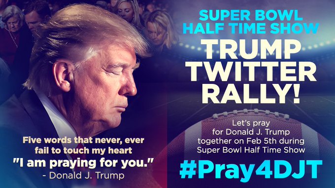 Follow Vote Trump Pics @VoteTrumpPics Trump Twitter RallyRT and show your support for DJT this Sunday, Feb 5th during Super Bowl Half Time Show at #Pray4DJT#SuperBowl 8:35 PM - 4 Feb 2017